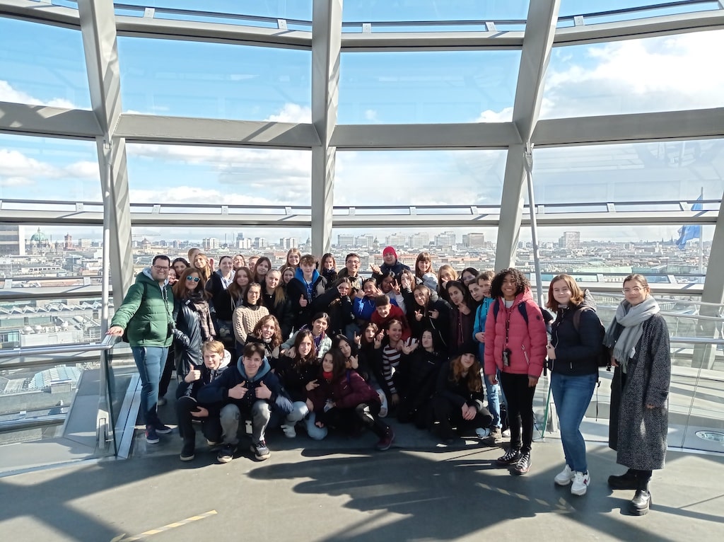 Am Montag machten wir eine Sightseeingtour in einem Bus durch Berlin und hielten kurz für ein Gruppenfoto am Brandenburger Tor an. Nach einem Spaziergang entlang der Prachtstraße „Unter den Linden“ besuchten wir die Kuppel des Reichstages und erfuhren Wissenswertes über die Stadt und die Geschichte des Reichstagsgebäudes.